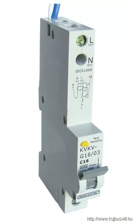 TRACON KVKV-G16/100 Kombinált védőkapcsoló, 2P, 1 modul, C karakterisztika 16A, 100mA, 6kA, A/AC, E3
