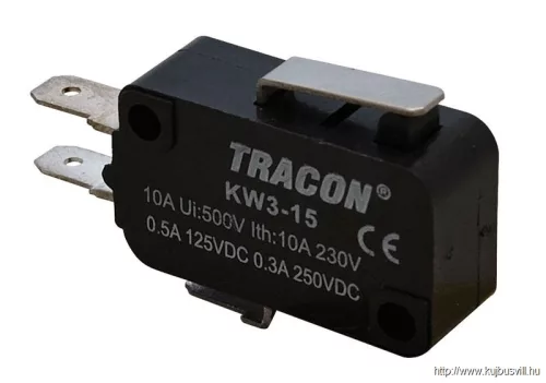 TRACON KW3-15 Helyzetkapcsoló, mikro, rugószáras 1×CO 10A/230VAC, 0,3A/250VDC, 15mm, 4,8x0,5 mm, IP00