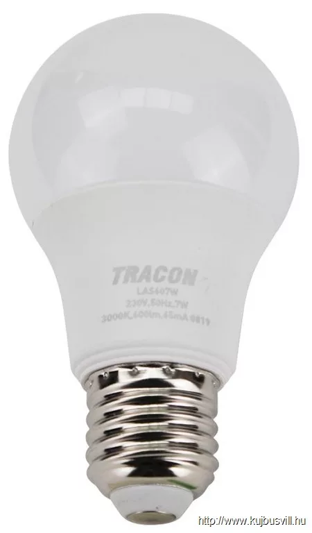 TRACON LAS607W Gömb burájú LED fényforrás SAMSUNG chippel 230V,50Hz,7W,3000K,E27,600 lm,200°,A60,SAMSUNG chip, EEI=F