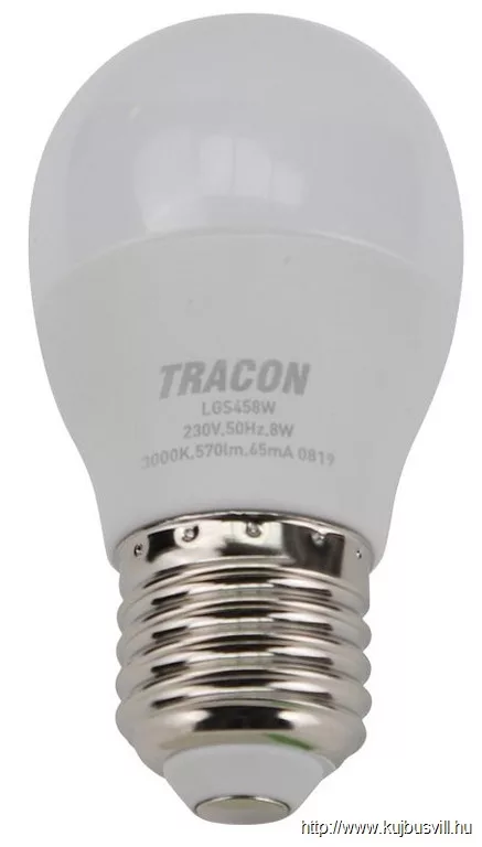 TRACON LGS458W Gömb burájú LED fényforrás SAMSUNG chippel 230V,50Hz,8W,3000K,E27,710lm,180°,G45,SAMSUNG chip, EEI=F