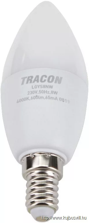 TRACON LGYS8W Gyertya búrájú LED fényforrásSAMSUNG chippel 230V,50Hz,8W,3000K,E14,710lm,180°,C37,SAMSUNG chip, EEI=F