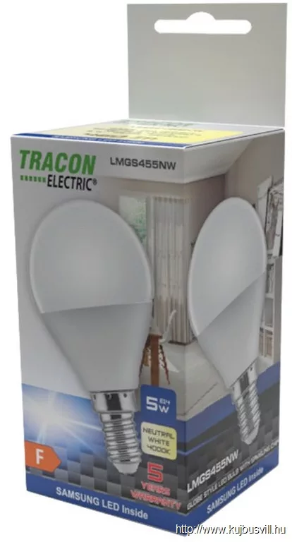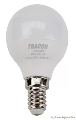 TRACON LMGS455NW Gömb burájú LED fényforrás SAMSUNG chippel 230V,50Hz,5W,4000K,E14,460 lm,180°,G45,SAMSUNG chip, EEI=F