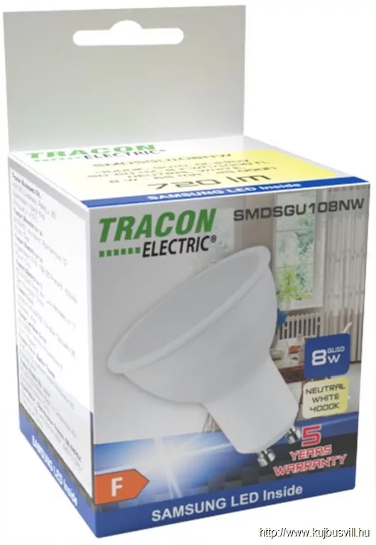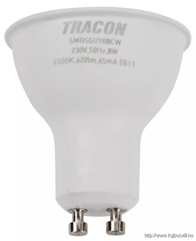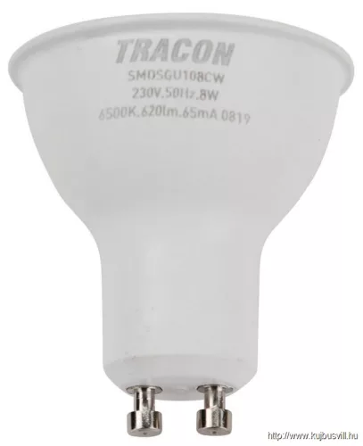TRACON SMDSGU108CW Műanyag házas SMD LED spot fényforrás SAMSUNG chippel 230V,50Hz,GU10,8W,740lm,6500K,120°,SAMSUNG chip, EEI=F