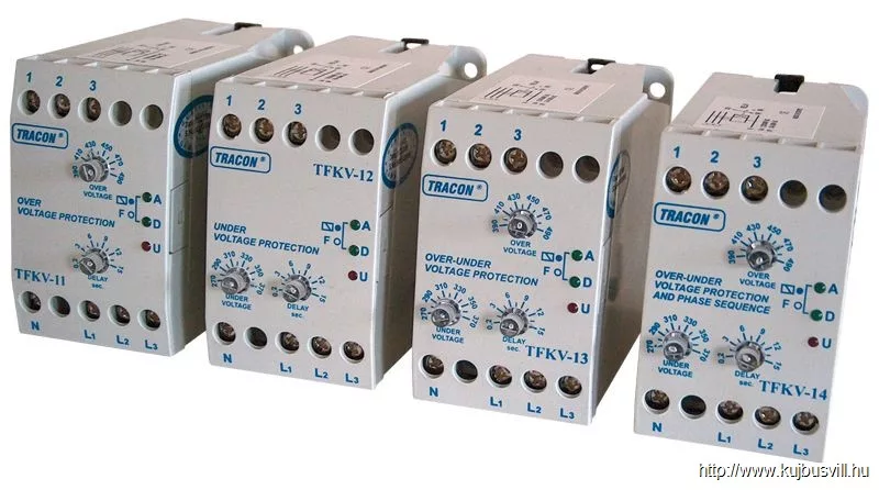 TRACON TFKV-12 Védőrelé, feszcsök/fesznöv. 3 fázisra, állítható Umin=270-370V / Umax=490V, 0.2s-15s, 5A/250V